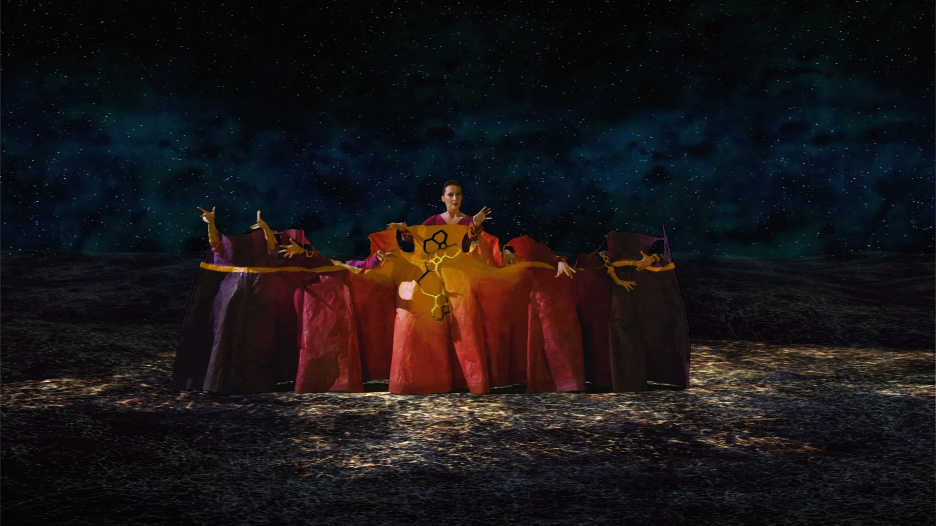 MIRAGES is a music and dance film that combines performing arts and virtual scenography into an interdisciplinary experience. The visual world of Mirages is composed by using real-time virtual technology, wherein performers interact with motion-capture animations. Motion trackers integrated into the costumes allow performers to interact with the set elements. The Mirages tells a story of a woman with a broken heart. Through five scenes, she recovers, accepts her loss and finally shares her newfound power with the community. A woman is heartbroken. Through the five scenes, she heals and finally becomes so empowered, that she can share that power to the community.